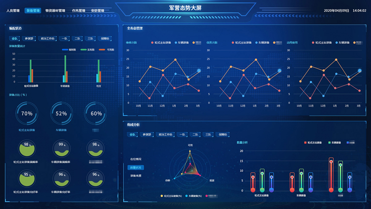 綜合保障系統依托物聯網、RFID識別和傳感技術,著眼作戰精準保障、戰備常態保障和官兵生活保障,對戰備物資、裝備器材、營房物資和被裝物資等的全生命周期的電子化管理,對官兵的健康實時監護。包含財務管理、軍需油運、武器裝備、衛勤管理、營房管理模塊。確保部隊出動,車輛給養油料跟得上,裝備維護情況實時掌握,營房管理工作平時與戰備同步推進。